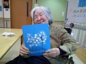 押しつけの強さで色の滲み具合や濃さも変わるため、それぞれ特徴的な作品が出来上がりました。「手も痛くならないし、簡単で楽しい」とのお言葉をいただきました。