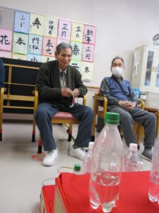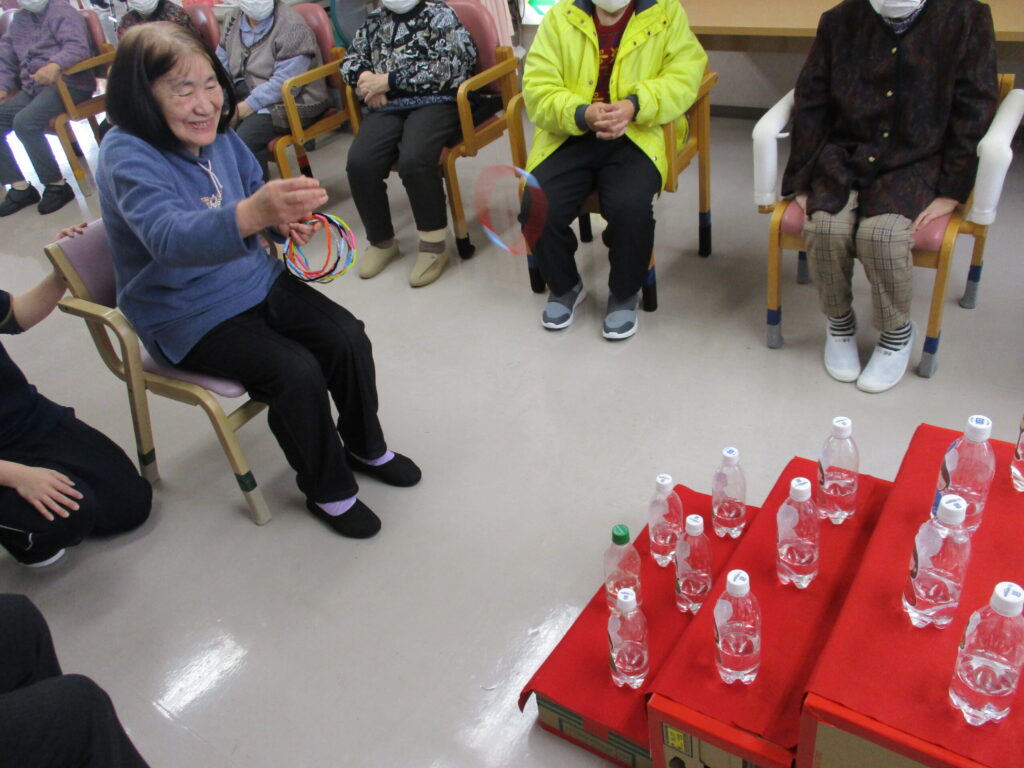 春らしい雰囲気を感じられるよう、ペットボトルをひな人形に見立てた的を用意し、ひなまつりならではの演出の中で輪投げレクリエーションに挑戦していただきました。